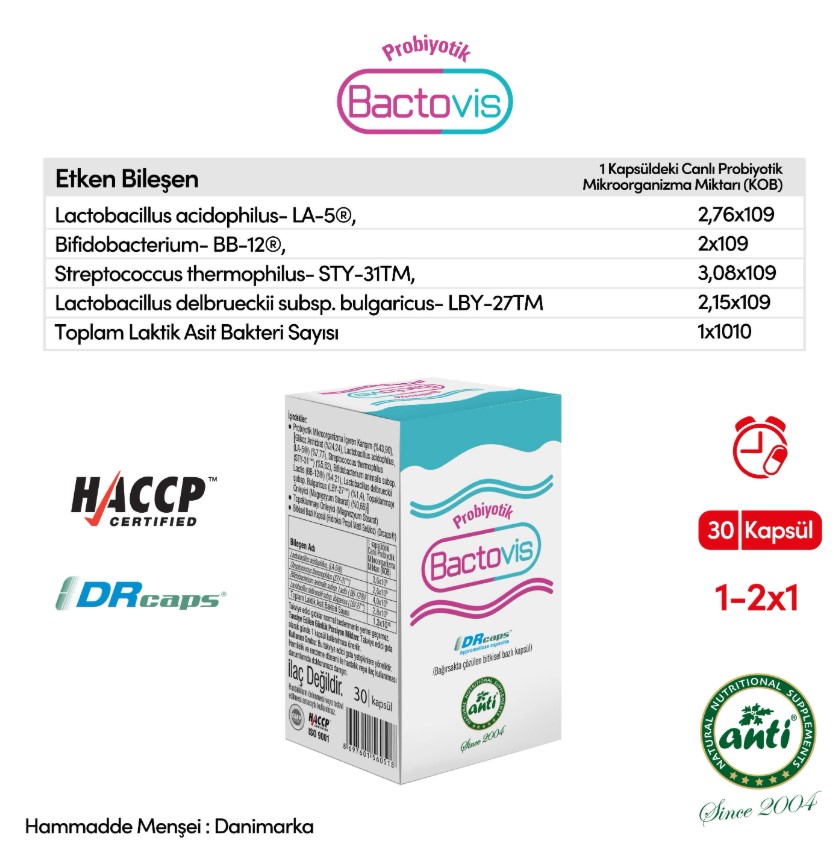 Bactovis probiyotikte kullanılan Drcaps kapsülleri, aside dirençli kapsüllerdir.Mide asidinden etkilenmez ve çözünmezler. Bu kapsüller ince bağırsağa ulaştığında açılır ve dağılır. Dolayısıyla probiyotik mikroorganizmalar mide asidinden etkilenmeden bağırsağa ulaşmış olurlar. Şayet bu kapsül teknolojisi kullanılmamış olsaydı 10 milyar canlı bakterinin tamamı bağırsağa ulaşamayacaktı.Bu kapsül teknolojisini kullanmakla tüm mikroorganizmaların canlı bir şekilde yuvalarına ( ince bağırsağa) sağ salim ulaşmaları sağlanmaktadır. DRCaps kapsülleri çam ağacının kabuğundan elde edilen Hidroksi Propil Metil Selüloz isimli bileşenden imal edilmekte olup tamamen doğal ve vegan bir içerik sağlar.