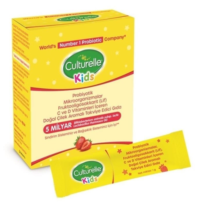 Probiyotik Mikroorganizmalar, Fruktooligosakkarit (Lif), C ve D Vitaminleri İçeren Doğal Çilek Aromalı Takviye Edici Gıda.