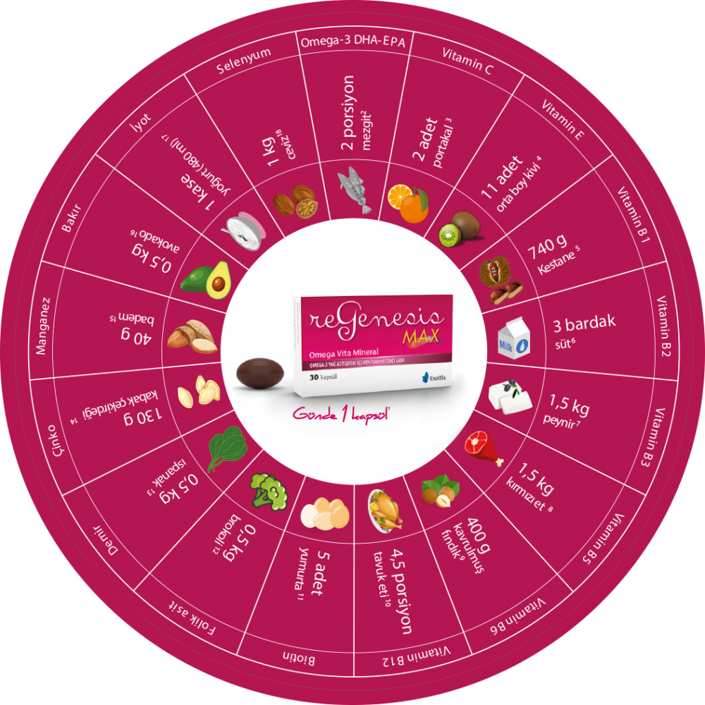 Türkiye Sağlık ve Beslenme Araştırması’na göre Türkiye’de hamilelik döneminde maternal diyetle alınan vitamin ve mineral miktarları ideal oranın çok altında kalmaktadır. Regenesis Max dünyanın en büyük balık yağı üreticilerinden biri olan ve IFOS,FDA,GOED, GMP sertifikalarına sahip Solutex firmasından aldığı ağır metal ve civa içermeyen saf ve güvenilir Omega-3’ün yanı sıra folik asit, B kompleks (B1, B2, B3, B5, B6, B12), D-biotin, C, E vitamini gibi vitaminleri ve iyot, çinko, bakır, demir, manganez, selenyum gibi mineralleri içeren zengin bileşenleriyle hamileliği planlarken, hamilelik boyunca ve emzirme döneminde seni ve bebeğini destekler.