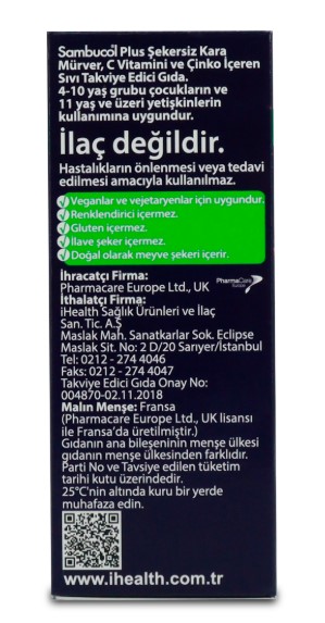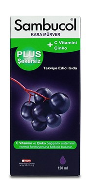 Sambucol Plus Şekersiz Kara Mürver, C Vitamini ve Çinko İçeren Sıvı Takviye Edici Gıda. 4-10 yaş grubu çocukların ve 11 yaş ve üzeri yetişkinlerin kullanımına uygundur.