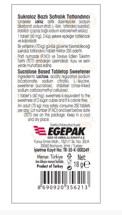 - Bir yetişkinin (70 kg) günlük güvenle kullanabileceği Takita Sukralozlu Tablet Tatlandırıcı miktarı 250 tablettir.